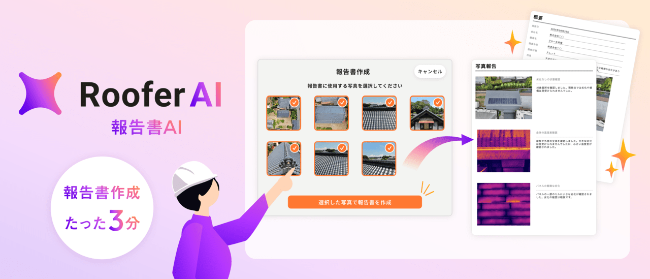 「RooferAI」は、現場から事務作業までを一気通貫でサポートするAIプラットフォームです。本アプリはその新機能として、点検写真を選ぶだけでAIが報告書を自動作成する仕組みを実現しました。従来2時間かかっていた報告書作成をわずか3分に短縮することで97.5%の効率化を実現し、属人化していた表現も自社のデータを反映した“自社らしい”内容で仕上げます。